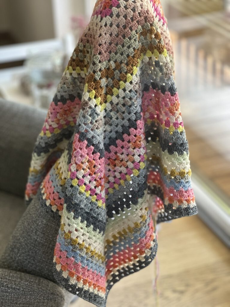 … ganz viele Wollreste ergeben viel Farbe und einen echten Hingucker. Ich liebe dieses HalfGrannySquare Tuch 🩷🩵🧡🤍💚